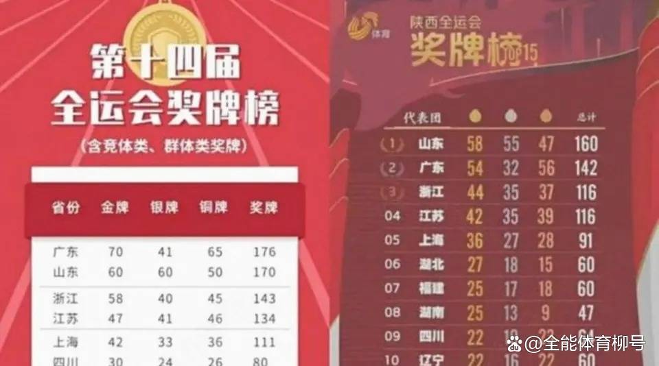 四年前的陕西第14届全运会上,争夺非常激烈。最终,山东代表团以山东58金55银47铜、160奖牌,高居奖牌榜和金牌榜的第一位。排在其后的是广东、浙江、江苏、上海、湖北湖南。